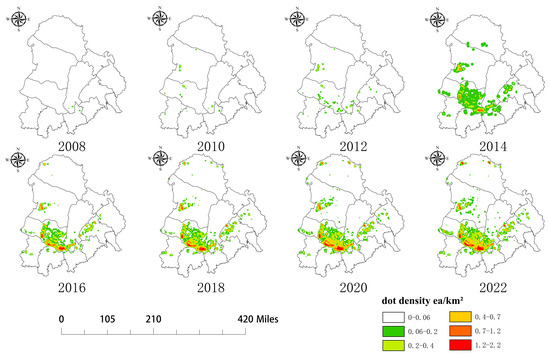 Spatial distribution of CPI farmland unit hotspots every two years from 2008 to 2022.