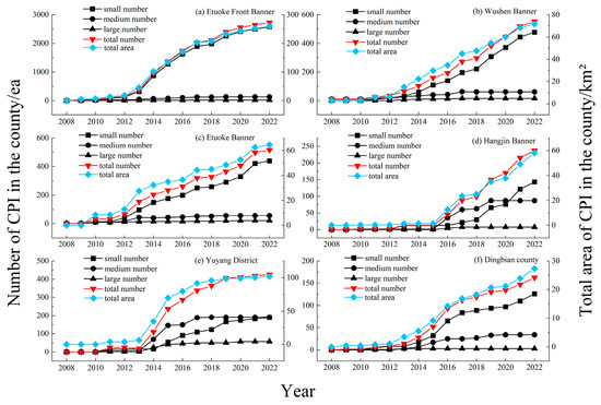 CPI farmland unit change trend of each county in Mu Us prefecture from 2008 to 2022. (Note: the figure only shows counties with more than 100 CPI farmland units by 2022; because the number of giant CPI farmland units is very small, they are counted as large CPI farmland units during calculation).
