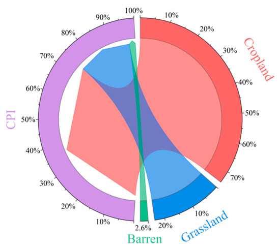 To explore the conversion relationship between CPI farmland and other land use types in the Mu Us region, we overlaid the data of newly added CPI farmland each year with the land use data of the previous year, and the results were drawn as a chord diagram (Figure 8). The formation of CPI farmland mainly involved the conversion process of cultivated land, grassland and wasteland. Among them, the conversion area of cultivated land was the largest, reaching 475.3 km2, accounting for 74% of the total amount of CPI area transferred. The second was grassland, with a conversion area of 149.5 km2, accounting for 23.4% of the total amount of CPI area transferred. The conversion area of wasteland to CPI farmland was the smallest, only 16.8 km2, accounting for 2.6% of the total amount of CPI area transferred.