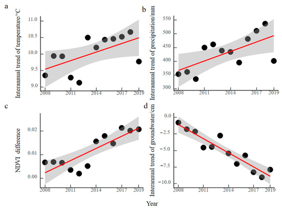 Interannual variation trends. ((a) Temperature; (b) precipitation; (c) NDVI differences; (d) groundwater).