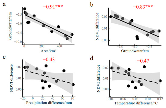 Correlation analysis. ((a) Correlation analysis of CPI farmland area and groundwater storage change; (b) correlation analysis of NDVI difference and groundwater storage change; (c) correlation analysis and NDVI difference and precipitation difference; (d) correlation analysis of NDVI difference and temperature difference. The significance level of predictor is *** p < 0.001).