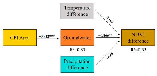 The structural equation model had a good fit (Fisher’s C = 10.449, df = 6, p = 0.11), and the relationships among the variables were effectively expressed (Figure 13). The increase in CPI farmland area would significantly enlarge the NDVI difference between 500 and 3000 m and 3000 and 5000 m, which was mainly achieved by consuming groundwater storage. The effects of temperature and precipitation on NDVI difference were not significant. The mediation effect of CPI farmland expansion on NDVI difference was 0.789, and the effects of temperature difference and precipitation difference were 0.162 and −0.06, respectively. The total effect could explain 65% of the variation in NDVI difference (R2 = 0.65).