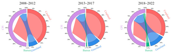 Proportion of CPI farmland land types transferred in three stages (2008–2012, 2013–2017, 2018–2022).