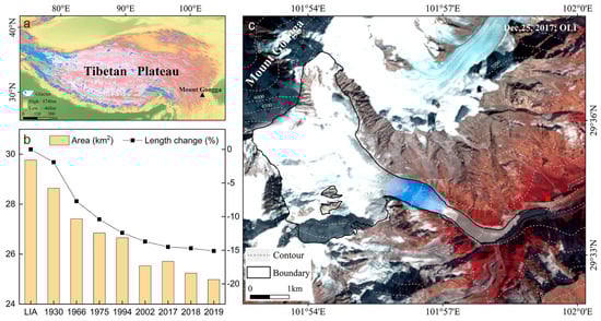 Location of HLG on the eastern slope of Mount Gongga (black triangle) in the southeastern edge of the TP (a), changes in glacier area and length since the Little Ice Age (LIA) (b), and HLG (c) based on Landsat-8 image acquired on 25 December 2017. Red square in (c) denotes the location of GAEORS, and blue color in (c) shows the icefall.