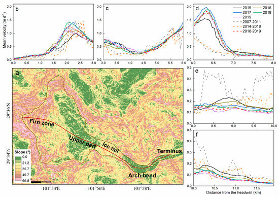 Glacier central flow line (a) and surface velocity variations of the firn zone (b), the upper part of the icefall (c), the icefall zone (d), the arch bend (e), and the terminus (f) from 2007 to 2019. The background in (a) shows the slope of HLG and its surroundings. Datasets for 2007–2011 and 2014–2018 are from Liu et al. (2019) [45].