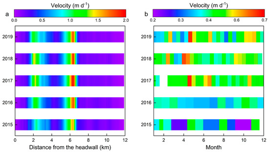 Annual (a) and monthly (b) variations in HLG surface velocity along the central flow line during 2015–2019.