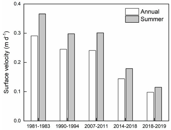 Annual and summer surface velocities in the ablation zone below the icefall observed during different periods. Annual datasets for the periods of 1981–1983, 1990–1994, 2007–2011, and 2014–2018 are from Li and Su (1996) [7], Su et al. (1996) [44], Liu et al. (2019) [45], and Liu et al. (2019) [45], respectively, while summer datasets were observed in 1981 [7], 1991 [44], and 2008 [31].
