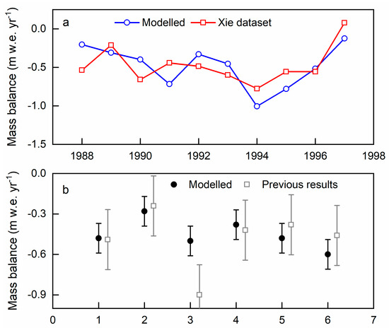 Comparison of time series of modeled mass balance and previous estimates of Xie et al. (2001) [51] (termed Xie dataset) for the period 1988–1997 (a) and mean modeled mass balances and previously estimated values over different periods (b). Error bar in (b) indicates standard error. The number order of 1–6 in (b) denotes the results from Xie et al. (2001) [51], Li et al. (2009) [54], Zhang et al. (2015) [55], Zhang et al. (2012) [41], Li et al. (2010) [54], and Cao et al. (2019) [56], respectively.