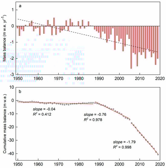 A similar variation in the cumulative glacier mass balance is observed for the study period (Figure 7b). The cumulative mass balance of the glacier is about −1.67 m w.e. for the period 1950–1987, which only represents about 4% of the total cumulative mass loss for the period 1950–2019. By contrast, about 65% of the total cumulative mass loss is observed during 2006–2019, especially in the recent decade (44%). This reveals that HLG has undergone largely accelerated mass loss since 2006 (Figure 7).
