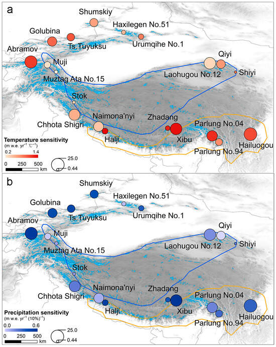 Spatially variability in mass balance sensitivities of TP glaciers to 1 °C temperature increase (a) and 10% precipitation increase (b). Blue and yellow lines denote the boundaries of maritime and extremely continental glaciers, which are from Shi et al. (2005) [61]. Circle size denotes glacier area size. The details of glaciers in figure and their climate sensitivities can be found in Supplementary Table S2.