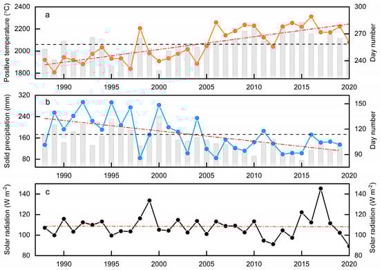 Variations in positive temperature sum (a), solid precipitation (b), and shortwave radiation (c) observed at the GAEORS near the glacier terminus for the period 1988–2020. The histograms in (a,b) represent the day with the air temperature above 0 °C and solid precipitation, respectively. Black dash lines indicate the average value of the day number for the period 1988–2020, and red dash dot lines denote the linear fit.