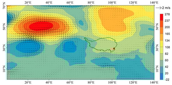 Previous studies have found that large-scale atmospheric circulation patterns have an important influence on TP glacier mass change [10,42,68,69,70]. However, our knowledge of the link between HLG mass balance and atmospheric circulation patterns is poor. Here, we calculate the differences in circulation patterns (geopotential height and wind fields at 500 hPa levels) between the periods of 1988–2005 and 2006–2019 during the monsoonal season (June–September) to investigate the influence of large-scale atmospheric circulations on interannual variation in HLG mass balance. Figure 10 shows a zonal wavy variation in the 500 hPa geopotential height and wind fields extended from Europe to Asia. Compared to 1988–2005, the 500 hPa geopotential height increases markedly in Europe and northern Asia for 2006–2019, while it shows a decreasing trend in northern Africa and southwestern and southern Asia. In the TP and surroundings, the eastern part is characterized by the positive geopotential height anomaly, while the negative geopotential height anomaly is observed in the western part. Meanwhile, the anticyclonic circulation is observed in central Europe and northern Asia, while the cyclonic circulation occurs in north Africa and southwest Asia (Figure 10).