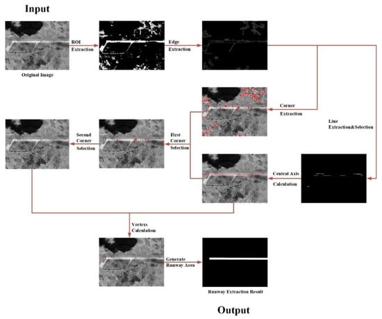 The main purpose of this part is to extract edge parallel line segment pairs and endpoint coordinates of the runway. Feature extraction mainly consists of three stages: (1) establishment of feature extraction model, (2) extraction of runway edge parallel line segment pairs, and (3) extraction of runway endpoints. The implementation process of feature extraction designed in this section is shown in Figure 2.