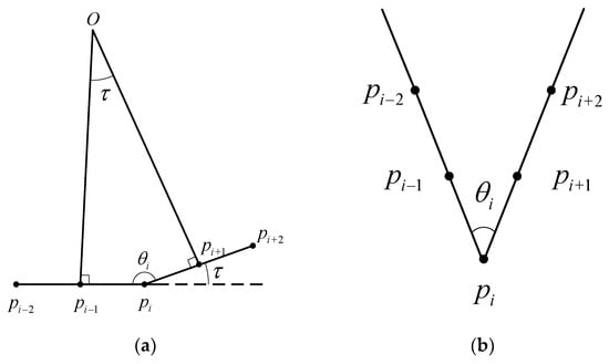 After the calculation of the edge pixel’s curvature, our aim is to extract the sets of line segments and the sets of corner points, respectively. Theoretically, the geometric characteristics of a straight line with zero curvature can be used to identify and extract straight line segments in continuous edges. However, due to the interference of digital image quantization and noise, the actual curvature value of the edge straight line segment after Gaussian smoothing will be greater than zero. And for corner extraction, a point with a local curvature maximum in a continuous edge is regarded as a corner. Thus, the key to this part is how to determine the curvature threshold of straight lines and corner points. Referring to the algorithm proposed by the author [47], we establish the functional relationship between angles and curvature values based on the intuition of first-order geometric angles (as shown in Figure 3).