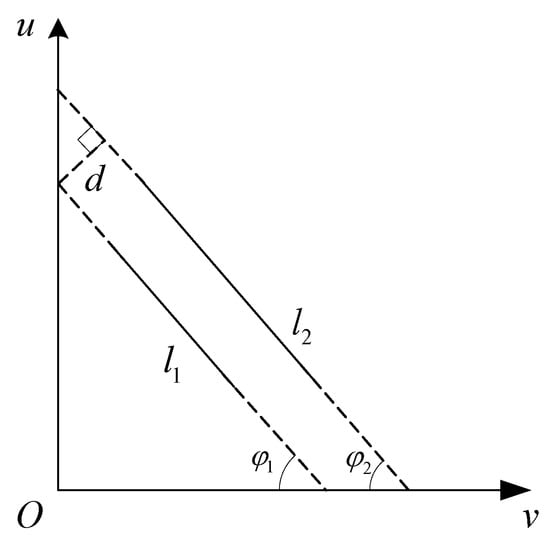 (1) Parallel constraints. First, we fit each line segment in the set based on the least squares method, and calculate the slope and intercept parameters of each line segment. Then the parallel line segments will be screened by setting the angle difference threshold of line segments (as shown in Figure 4). Referred to the experience of the author [15], we set the threshold parameter to 0.05 radian. If the angle difference between two straight line segments is less than the threshold , the corresponding line segments are regarded as parallel lines, and then we can obtain the set of parallel line segments as: