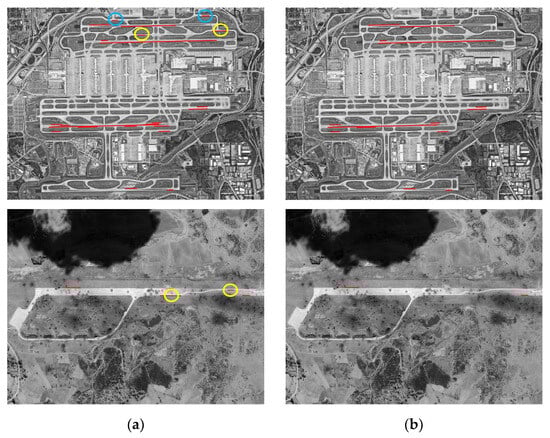 Overall, the proposed runway extraction method in this article performed well on different test images (including post-damage images and images with complex runway structure distribution), the average completeness of runway extraction result is more than 90%, and our method has the advantage of running time (as shown in Table 3).