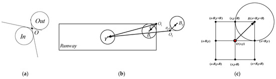 (2) Regional feature constraints. First, we select the inner and outer areas of the runway along the tangent direction of the corner point, and the areas are represented by circular areas (as shown in Figure 7a) in order to reduce the interference of the damaged area on the regional characteristics. Based on the high brightness characteristics of the undamaged area of the runway, we believe that the area with the maximum gray mean value in the corner neighborhood is the inner area of the runway, and the opposite area is the corresponding outer area. To simplify the calculations, we take the candidate corner point as the center and R as the distance to select 8-neighborhood pixel coordinate points, and then take these 8-neighborhood pixel coordinate points as the center of the circle to construct circular areas, respectively (as shown in Figure 7c). Among these eight circular areas, the area with the largest grayscale average value is considered to be the inner area of the runway (as shown in Figure 7b), and the area in the opposite direction is considered to be the outer area of the runway. After the selection of the inner and outer areas of the runway, we will further screen the corner points based on the regional characteristics.