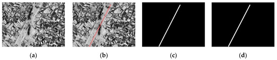 In the previous section, we can finally obtain the central axis parameters and endpoint coordinates of the candidate runway, respectively (as shown in Figure 2). By combining the central axis parameters and the endpoint coordinates, we can calculate and obtain the four vertex coordinates of the candidate runway (the width of the runway is used as prior information). Then, we connect the vertices belonging to the same candidate runway in sequence and fill the closed area to achieve the extraction of the runway area. After screening the pairs of parallel line segments above, there will be incorrect pairs of parallel line segments due to the influence of interference objects such as roofs and roads outside the runway, which will lead to the existence of false results in the final results of runway extraction. Based on the geometric structure characteristics and regional high brightness characteristics of the runway, we are going to eliminate the false results by imposing length constraints and rectangularity constraints on candidate runways: (1) Generally, the runway length is 800–4000 m [15] and the length of the candidate runway can be calculated as based on the coordinates of the runway endpoints and . Then, we can eliminate the candidate runways whose length exceeds the interval. (2) On the other hand, we define the index of rectangularity as , where denote the intersection area of the rectangular area of the candidate runway extraction result and ROI and denote the rectangular area of the candidate runway, and the value range of the rectangularity index is [0, 1]. Here, we set the threshold of the rectangularity index as and eliminate the candidate’s runways whose rectangularity index is less than the threshold. Then, we can obtain the final runway extraction results.