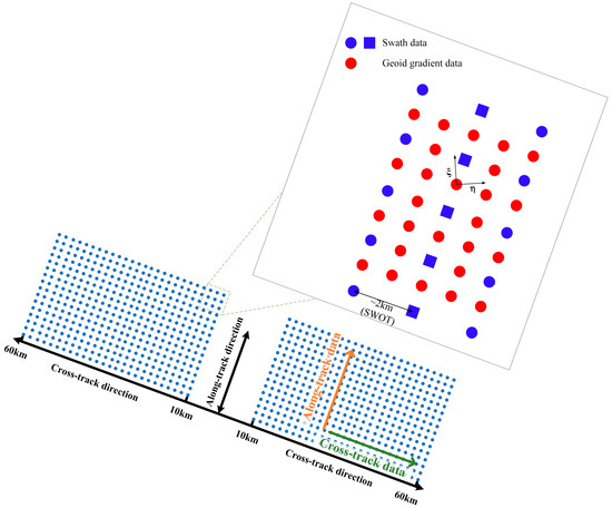 Based on the data processing experience from many scholars, the wide-swath data can be split into along-track and across-track directions [20,23,24]. The geoid gradients are calculated by utilizing information from adjacent points in multiple directions (as shown in Figure 4).