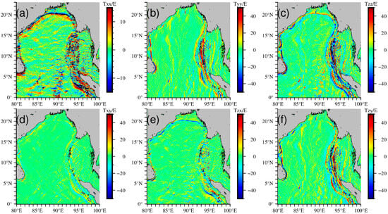 Combined with the seafloor topography (as shown in Figure 1), it can be found that the changes in Figure 5 are more obvious in the regions with drastic topographic changes, such as the near-shore region, the Burma Plate, the Sunda Plate, and around the 90°E ridge. The Tzz component in the above regions is the most obvious. The differences between the flat seafloor region and the drastic changes region are the largest. The Txy component is the least sensitive to the gravity changes caused by topography. The remaining four components have no significant obvious changes except in the Burma Plate and its surrounding areas.