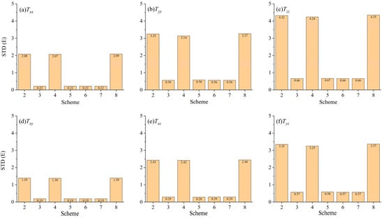 In Figure 9, as the mean of the verification residuals for each component is around 10−4 E, so the mean is not plotted. Only the STD is shown. For ease of comparison, the maximum value of the Y-axis in each subplot is set to 5 E. As shown in Figure 9, the poorest and best performances are observed in Tzz and Txy components, respectively. This indicates that the various errors have the greatest impact on the Tzz component and the least impact on the Txy component of the SWOT_GGT. Comparing the results of different schemes, it is evident that the inclusion of KaRIn error and phase error significantly affect the computation of the SWOT_GGT. These two errors dominate the statistics of the total error impact in Scheme 8.