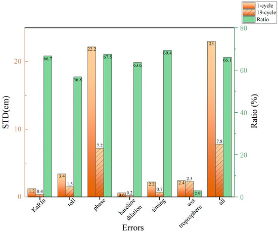 We calculate the STD of the differences between errors simulated for 19 cycles and 1 cycle. The results are plotted in Figure 11, where the “Ratio” indicates the ratio of the error weakened by 19 cycles of data relative to 1 cycle of data.