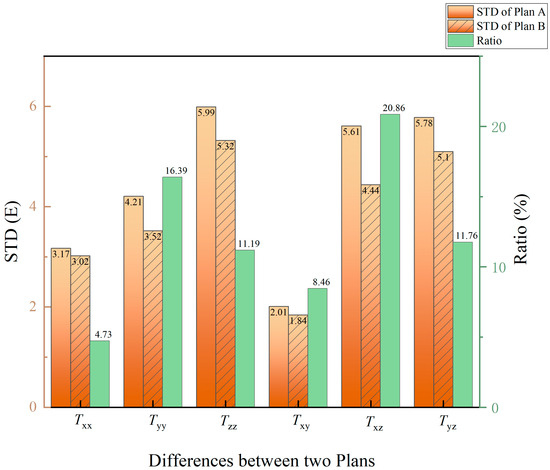 As shown in Figure 12, compared with the SWOT_GGT recovered by Plan A, the precision of the Tyy, Tzz, Txz, and Txy components of Plan B is improved significantly, by more than 11%. Experiments show that multi-cycle data can significantly reduce the influence of instrument errors on the full tensor of gravity gradients calculated by the discretization method.
