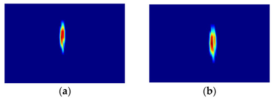 The geometric parameters of the single-column formation and the V-shaped formation are shown in Table 3. Figure 5 shows the spatial distribution model of the two formations without clutter. Figure 6 shows the distribution of the single-column and V-shaped formation in the RD images. The constructed RD images cover widely in the range and Doppler domains. The images have been cropped for ease of display in Figure 5 and Figure 6. The two types of ship formations have the same parameters, except for the formation shape. For the single-column formation, the maximum difference between the sub-targets and the formation center in the range and Doppler domains is 1.03 km and 0.0022 Hz, respectively. For the V-shaped formation, the maximum distance of the sub-targets and formation center in the range domain is 1.75 km, and the gap between and in the Doppler domain is 0.0019 Hz. There is less difference between sub-targets in the range domain and Doppler domain than in the HFSWR resolution given in Table 2. Formations are presented as extended targets with slight differences in outline.