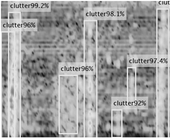 Faster R-CNN is pre-trained on ImageNet. According to the size of the clutter regions in multiple RD images, the anchors of the Faster R-CNN are adjusted to three scales (642,1282, and 2582 pixels) and three aspect ratios (0.5, 1.0, and 2.0). The anchors match the real target box with an overlap of more than 0.5. Figure 9 shows the clutter detection results of the Faster R-CNN. The bright vertical bar regions in the images are identified as sea clutter regions. The scores on the top indicate that the network has good recognition performance for sea clutter and meets the requirements of the preprocessing stage.
