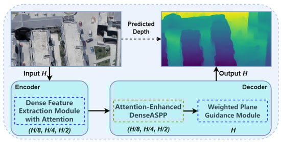 The overall architecture of our work. This architecture comprises an encoder and a decoder, with the input size of the remote sensing image set at 768 × 384. The encoder incorporates a dense feature extraction module with an attention mechanism. In the decoder, the attention-enhanced DenseASPP module and the weighted plane guidance module collaborate to predict the depth for the input remote sensing image.
