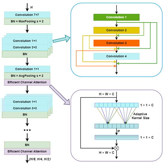 The efficient channel attention (ECA) mechanism enhances the attention of different channels to features, as depicted in the bottom-right corner of Figure 2. It initially reduces the spatial dimensions to provide each channel with a scalar representation, and the channel weights are adaptively learned through the convolution kernel size and the number of channels. Notably, an attention module has been inserted after each dense block in the network structure, performing the channel attention calculation on the feature maps outputted by each block. This facilitates the rapid and effective identification of noteworthy positional features during each stage of feature extraction.