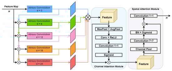 To account for global structures, we employ atrous convolution modules, which expand the effective receptive field of the convolution kernel. This expansion enables each kernel to capture information from a larger distance, ranging from a small to a large scale. This approach proves beneficial for addressing long-range dependencies in the image, particularly suited for remote sensing images. Simultaneously, the atrous convolution maintains the resolution of the feature map, aiding subsequent tasks. By adjusting the dilation rate, dilated convolution obtains feature representations with different receptive field sizes, capturing multi-scale features that comprehensively represent the image and provide rich information for the subsequent network. Importantly, dilated convolution does not introduce additional parameters when enlarging the receptive field, avoiding an increase in the training burden or difficulty compared to other architectures.