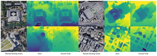 Nevertheless, it is noteworthy that these methods have predominantly undergone extensive experimentation and validation on public datasets like the KITTI autonomous driving dataset [] or the NYU Depth V2 indoor scene dataset []. Yet, the direct application of these methods to remote sensing scenes is challenging due to their substantial differences. Remote sensing scenes, in contrast to autonomous driving or indoor datasets, exhibit distinctive characteristics. They encompass significantly larger coverage areas than indoor scenes, and the distribution of scenes in autonomous driving datasets tends to be more uniform, featuring similar image structures and styles. In remote sensing scenes, however, the distribution of foreground and background is uncertain. Moreover, these scenes present unique challenges, including occlusion and environmental complexity, which are not easily captured through training on the aforementioned datasets. Additionally, in remote sensing scenarios, there are typically extensive low-texture areas, within which there exist some targets that are not easily distinguishable, among other characteristics. Consequently, adapting existing monocular depth estimation methods for remote sensing necessitates innovative approaches that account for these divergences and challenges.