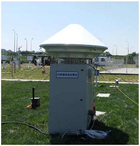 The MMWR used in this study was the HMB-KPS model manufactured by Beijing Institute of Radio Measurement, with a working wavelength of 8.57 mm and a zenith observation mode with an elevation angle of 90° (Figure 1). It has a maximum detection range of 20 km. This radar has high sensitivity, with a precision of 0.01 dBZ in its reflectivity factor and 0.01 m/s for radial velocity and spectral width. It also has high spatiotemporal resolution, acquiring a data file every minute with a range resolution of 30 m. Gossard and Tao used power spectral data from MMWR to retrieve cloud droplet spectra and cloud microphysical properties through deconvolution and optimal cost function spectral separation technology, respectively [24,25].