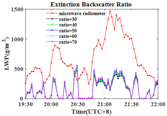 The evaluation and verification of retrieval quality are mainly conducted by assessing the retrieval of cloud microphysical properties and comparing them with other relatively reliable detection results. Microwave radiometers are considered to be a more accurate method for detecting the LWP in clouds, with a 1 K brightness temperature deviation resulting in an approximate 30 g/m2 deviation in the retrieval of the LWP by the microwave radiometer [35]. Since there were no aircraft measurement data available to compare the Re and Nd of cloud droplets and satellite products can only provide cloud top data rather than vertical profiles, we viewed the LWP retrieved from ground-based microwave radiometers as the truth [36]. Subsequently, the influence of different extinction backscatter ratios on LWP in combined retrieval was analyzed.
