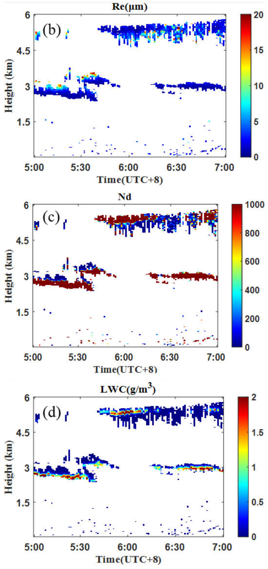 The vertical distribution of cloud droplets Nd is shown in Figure 9c; high-value areas of Nd usually appear together with low-value areas of Re and may be attributed to the negative correlation between Nd and Re (Equation (17)). In addition, the accuracy of the combined retrieval results of Nd remains to be debated. Previous studies have shown that the uncertainty of Nd calculated by this method ranges from 25% to 75% [38].