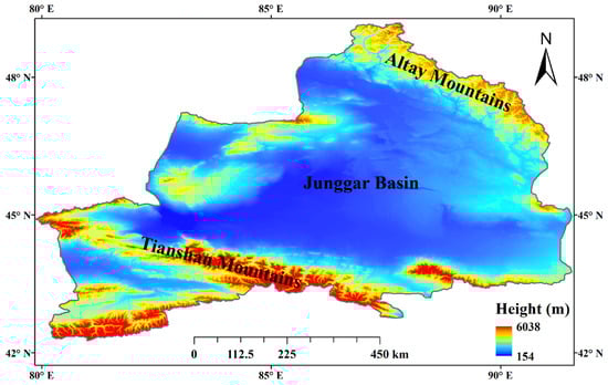 The research is focused on the northern Xinjiang region, spanning from 79.0° to 92.0°E and 42.0° to 50.0°N, situated along the northwest border area of China. This region boasts diverse topography, with the Altay Mountains in the north and the Tianshan Mountains in the south, reaching a maximum elevation of 7440 m. The central portion comprises the Junggar basin, maintaining an average elevation of 400 m. Terrain heights across Northern Xinjiang are depicted in Figure 1. The climate in this area is characterized as a temperate continental climate, owing to its unique geographical location in the Eurasian continent’s hinterland [28]. Influenced by Siberian circulation, the region experiences a cold and snowy winter, with snow cover persisting for approximately 120 days from November to March. In certain areas, this snow cover can endure until May [28,29]. This climatic profile renders the study area ideal for investigating the regional-scale sensitivity of snow simulations to parameterization schemes, given its abundant snow resources.
