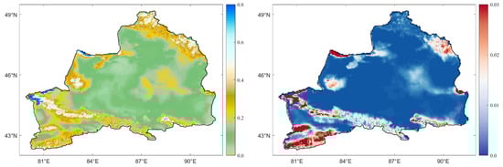 The CMFD dataset served as the driving force for the 48 scheme combinations, resulting in snow depth simulations across Northern Xinjiang. As illustrated in Figure 2, it displays the annual average snow depth from the 48 ensemble simulations and the variance in the snow depth ensemble simulations. The annual average snow depth reveals a predominant distribution in the mountain regions, particularly evident in the Tianshan and Altay Mountains, where the maximum annual average snow depth approaches 2 m, primarily concentrated in the southern part of Tianshan Mountain. Conversely, the Junggar Basin exhibits significantly lower snow depths, attributed to the arid and semi-arid climate characteristics in Northern Xinjiang. The possible reasons for this phenomenon could be that the colder temperatures in the mountainous regions facilitate snow preservation, while the warmer and drier conditions in the basin contribute to snow sublimation and melting. The simulation results employing the 48 scheme combinations align with the spatial distribution of average snow depth, corresponding to the snow distribution characteristics in Northern Xinjiang. This alignment underscores the Noah-MP model’s ability to accurately simulate snow processes in the region. Importantly, we refrain from comparing the averaged snow depth results of multiple scheme combinations with the corresponding snow depth observational data in this study. Model performance evaluation has been addressed in previous research, specifically assessing the snow simulation capabilities of the Noah-MP model in Northern Xinjiang, China [27]. Our focus here is solely on discerning differences in simulation results among different combination schemes within the Noah-MP model.