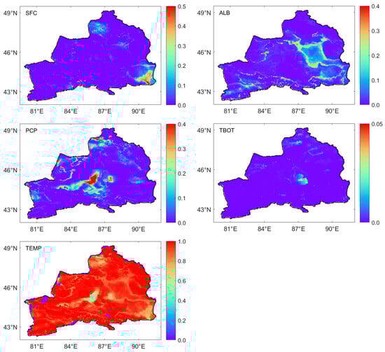 In our previous study, a qualitative analysis was undertaken, establishing that the modeled snow depth exhibited sensitivity to the parameterizations of the physical processes SFC, ALB, PCP, TBOT, and TEMP. In this current study, we extend our analysis to quantify the sensitivity of modeled snow depth to these parameterizations in Northern Xinjiang. The 48 scheme combinations were randomly generated by incorporating options for the five sensitive physical processes. Figure 3 illustrates the Sobol total sensitivity of the modeled snow depth to these five physical processes, showcasing the parameterization sensitivity patterns across Northern Xinjiang. Higher values in the figure indicate greater sensitivities. As depicted in Figure 3, the sensitivity patterns of these parameterizations display significant differences. Two parameterization schemes are assigned for the physical process of SFC, and the choice between these two schemes notably influences the simulated surface layer drag coefficient. The first scheme incorporates the zero-displacement height, while the second considers the difference between roughness length for heat and momentum in calculating the surface layer drag coefficient, leading to substantial variations in t water and energy computations in the model. In Figure 3, Sobol sensitivity indices in most areas of Northern Xinjiang are below 0.1, with many regions showing indices at zero, indicating weak sensitivity of surface physical processes in the majority of the region. However, higher Sobol sensitivity indices are observed in the eastern part of the Tian Shan region, reaching a maximum of 0.5. This indicates a stronger sensitivity of surface physical processes in that area, highlighting significant variations in simulated snow depth results when utilizing different parameterization schemes for the surface. Additionally, localized areas near the western part of the Altay Mountains exhibit slightly higher Sobol indices than other regions, averaging around 0.3. This suggests stronger sensitivity of the physical process SFC, specifically in the eastern part of the Tianshan Mountain region, while its sensitivity is weaker in other areas of Northern Xinjiang.
