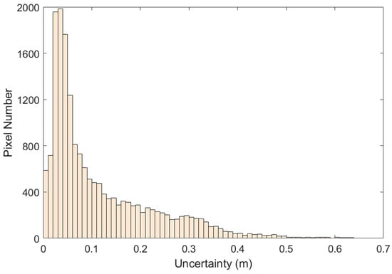Expanding on the sensitivity analysis of quantified parameterization schemes, we proceeded to quantify uncertainty in the simulated outcomes of a multi-parameterized scheme ensemble for snow depth in Northern Xinjiang. Figure 4 illustrates the uncertainty in snow depth simulation results for 48 combination schemes. Notably, most areas in Northern Xinjiang exhibit small uncertainties, gradually increasing with altitude. For instance, the Tianshan Mountains region displays significantly higher uncertainty compared to the Junggar Basin, ranging mostly from 0.2 to 0.4 m. In local mountainous areas, the uncertainty in snow depth can exceed 0.5 m. This discrepancy is attributed to both the greater snow depth in mountainous regions, leading to relatively larger errors, and the selection of different parameterization schemes for specific physical processes, causing significant variations in snowmelt mechanisms. The 48 combinations, derived through the permutation and combination of parameterization schemes for five sensitive physical processes, underscore the impact of model structure on simulation results. Figure 4 emphasizes that regions with higher uncertainties are concentrated in high-altitude areas such as the Tianshan Mountains and Altay Mountains, suggesting that distinctions between parameterization schemes are primarily manifested during the snowmelt stage. While different combinations of schemes result in diverse snowmelt mechanisms, areas with lower altitudes and less snow accumulation exhibit comparatively smaller uncertainties in the overall simulation results for the multi-parametric scheme ensemble. Figure 5 delves into the number of pixels within different uncertainty intervals in Northern Xinjiang. The majority of pixels have an uncertainty range for snow depth below 0.1 m, with the highest number falling within the 0.02–0.04 m range, indicating generally low uncertainty in simulated snow depth. This may stem from the small amount of accumulated snow in these pixels, resulting in minimal errors or negligible differences among the 48 scheme combinations. Additionally, the figure reveals a considerable number of pixels with a snow depth simulation uncertainty range exceeding 0.1 m, signifying substantial variations in simulated snow depth results in certain areas due to the sensitivity of parameterization schemes. These differences may arise from the varied snow accumulation and melting mechanisms associated with the diverse combination schemes.