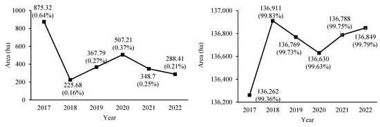 Area of the willow (left) and non-willow (right) classes in the period of 2017–2022.