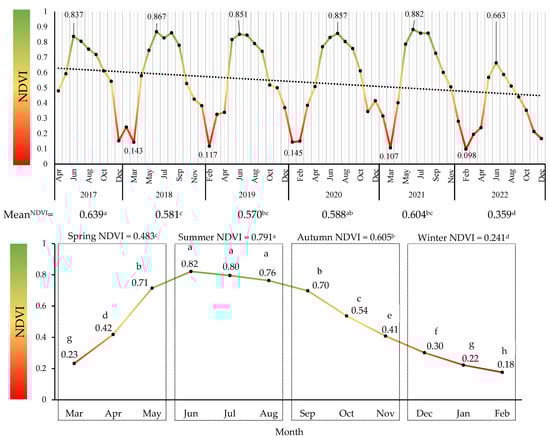 Changes in NDVI in the study area from 2017 to 2022: yearly average scale (top) and seasonal and monthly average scale (bottom). (Different letters indicate statistically significant differences (p ≤ 0.05)).