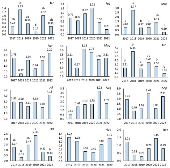 The average daily precipitation changes by month from 2017 to 2022. (Different letters indicate statistically significant differences (p ≤ 0.05)).