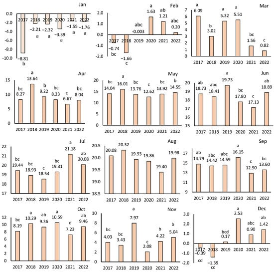 The average daily temperature changes by month from 2017 to 2022. (Different letters indicate statistically significant differences (p ≤ 0.05)).