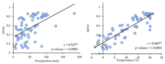 The results of correlation analysis, which depict the monthly variations in NDVI, precipitation, and temperature, are shown in Figure 10. According to the findings, there is a strong and significant (at the 1% level) positive correlation between NDVI, precipitation (r = 0.527), and temperature (r = 0.883), respectively.