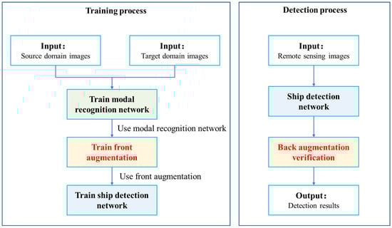 Hence, we propose a modal transforming method for ship detection in remote sensing imagery. As illustrated in Figure 1, the general process of our method can be divided into two main steps: the training process and the detection process. The proposed method is run in a transparent way, no matter what kind of backbone network is used. The additional input target domain images in our method can be all negative samples, as the target information is unnecessary and there is no need to label the image for training.