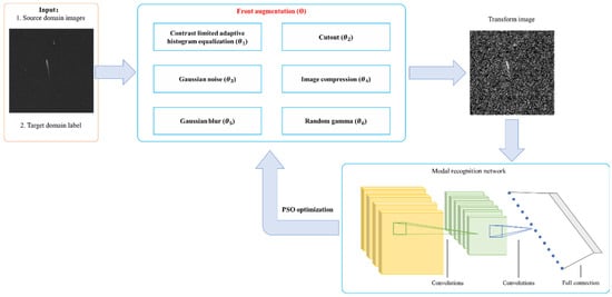 After training the modal recognition network, we next train the front augmentation process to achieve the transformation relation from the source domain to the target domain. The aim of the front augmentation process is to find a reasonable way to generate different kinds of target domain images using source domain images as input to reduce the modal differences when further training the detection network. In order to obtain the augmentation operation with explicit physical meaning, we use a combination of pixel-level and spatial-level image augmentation transforms, and the basic transforms are chosen as follow: contrast limited adaptive histogram equalization, cutout, gaussian noise, gaussian blur, image compression and random gamma correction. We encode these transform parameters and use heuristic algorithms like particle swarm optimization to obtain the front augmentation process, and the objective function is the absolute error between soft prediction of the modal recognition network and the one-hot encoding for the target domain. An illustration of front augmentation training is shown in Figure 3. Here, are the transform parameter set, for example, is the transform parameter for contrast limited adaptive histogram equalization, represents the upper threshold value for contrast limiting and represents the size of grid for histogram equalization. After obtaining optimized , we can ignore these parameters with small values to further simplify the operations of front augmentation.