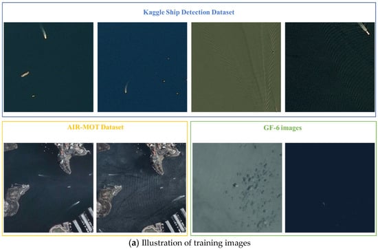 In this section, we train the model mainly using the Kaggle Ship Detection Dataset [] and verify the effectiveness of our method using real remote sensing images observed by GaoFen satellites. The total size of the training set is about 15,000, with about 80% of them from the Kaggle Ship Detection Dataset, 10% from the AIR-MOT dataset, and 10% from the GF-6 satellite. In the training process, the dataset is split into training and validation sets with an 80–20 split. The general real-satellite experiment process is as follows.