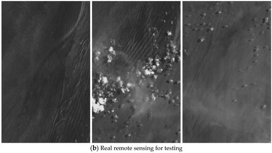 The training dataset and testing views of a real remote sensing image are as shown in Figure 7, Figure 7a shows the training color images and Figure 7b illustrates the real remote sensing PAN images. We can observe huge differences between different modal images. The size of the real remote sensing image is about 14,000 × 24,000, the size of each slice is 1500 × 1500 and the padding size is 1000, and we use 10 views of a real remote sensing image with over 15,000 slices for evaluating the performance. The ground truth of the real remote sensing image is checked manually according to the ship’s AIS data in same time period.