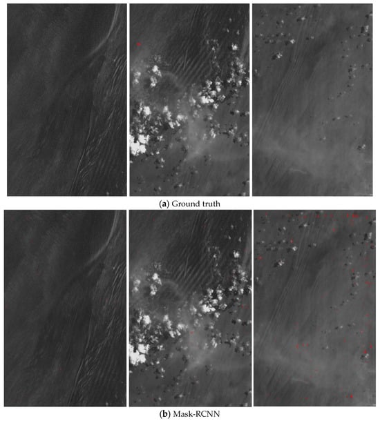 Figure 8a shows the ground truth of these three views of PAN images; these images are observed by GaoFen-3 with a resolution of 0.75 m, and only one ship target lies in the middle-column image. Figure 8b shows the detection result from conventional Mask-R-CNN, which generally has the least satisfying result of the comparative detection backbone networks, with 23 detection results in the first image, 33 detection results in the second image and 171 detection results in the third image; although the true ship target is detected, a total of 225 false-alarm targets are also incorrectly detected and the mFAR is about 24%. Figure 8d shows the detection result of conventional YOLOv8, which has the best satisfactory result of the detection backbone networks on average, with 19 detection results in first image, 21 detection results in the second image and 29 detection results in the third image. Similarly, the true ship target is detected, total 68 false-alarm targets are also incorrectly detected and the mFAR is about 7.3%. Figure 8c,e show the detection results of the same structure with the Mask-R-CNN and YOLOv8 networks, respectively; using our method, all the networks can achieve 100% precision and 0% mFAR in these PAN images, which verifies the efficiency and applicability of the proposed method.